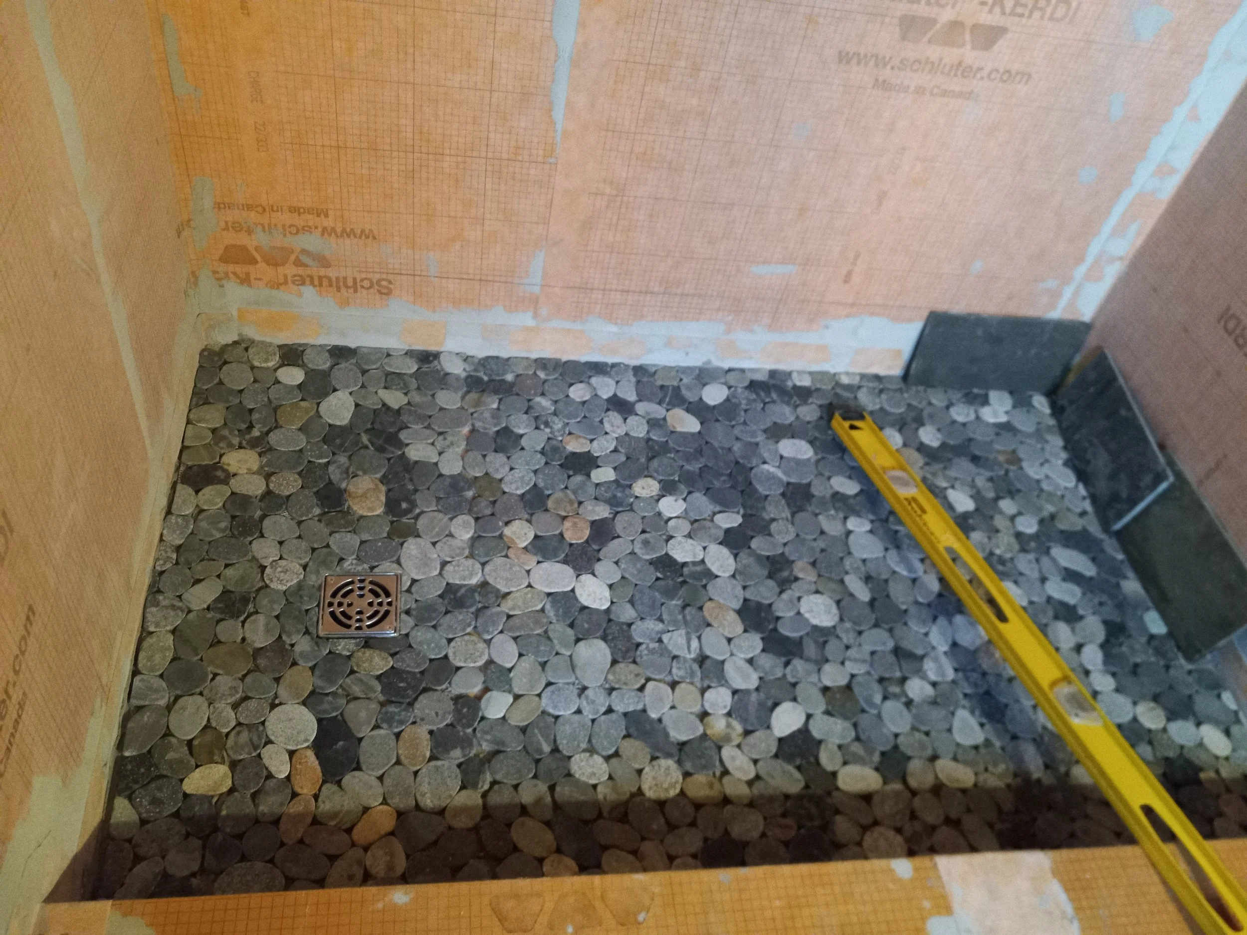 It was worth the wait! It held wonderfully! Hallelujah! After draining it and letting it dry, it was time to put in the shower floor and drain. Despite my being adamant about the slate tile elsewhere, I didn’t really want it as a shower floor. I wanted to keep expenses down, but not to the degree that it would veer from the look we were going for. In our previous shower project, we opted for flat river rock, and if you scour the internet for tiled showers, you’ll find that most other tiled showers have something similar. After walking back and forth through the tile store about 6 times, we finally decided it was worth it to just go with the river rock. It’s still natural stone, it isn’t slippery, and the varying color options allowed us to merge the floor and wall tile into a complete look.