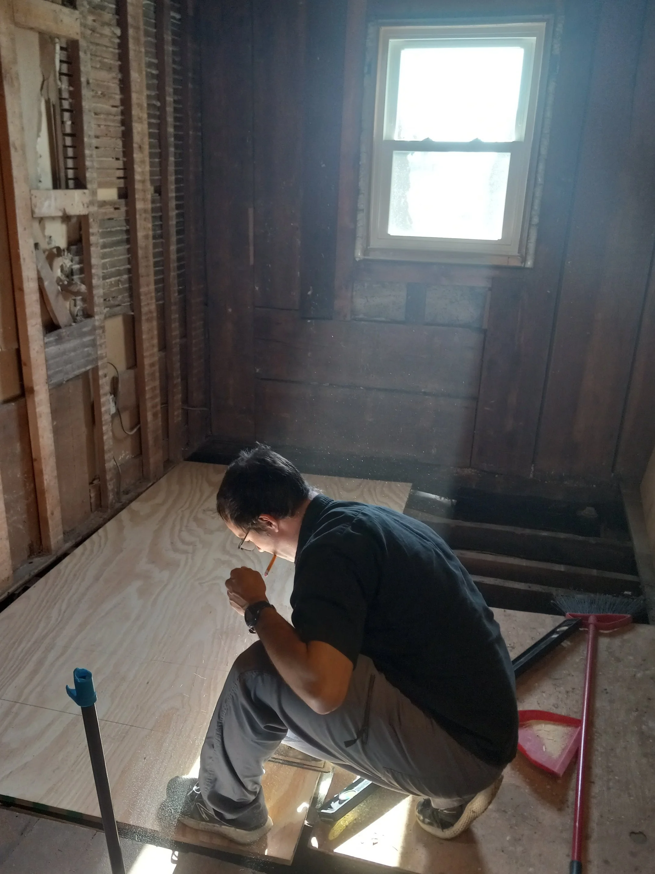 This left us with quite the height difference to make up for from any new floor we might lay to the surrounding floor heights. We knew we planned to tile the floor, so we would need to put down plywood as a subfloor, then hardy backer, and mortar and tile. Luckily, when you add all that up, the height matches up quickly. Still, we opted for a very thick plywood layer.